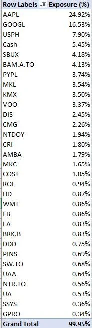 Below are two images that include the current positions and weights, as of 14 March 2021, of their trust accounts and their education account. The weights are deceiving because our education savings account has a total value five times greater than the combination of the value of the two trust accounts. Eight of the positions in the education account have more than doubled in value. PayPal is nearly a 6-bagger; Apple and Google are nearly 5-baggers.